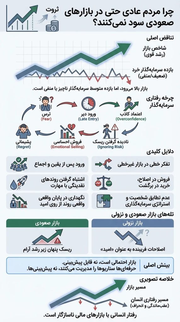 اگرچه بازارهای مالی در بلندمدت روندی صعودی دارند، اما اغلب سرمایهگذاران خرد از این رشد منتفع نمیشوند. دلیل اصلی، خطاهای رفتاری مانند ورود دیرهنگام، تصمیمگیری احساسی، ذهن خطی در بازاری غیرخطی و ناتوانی در مدیریت عدمقطعیت است. مقاله نشان میدهد چگونه ترس، طمع و زمانبندی اشتباه، سود بازار را به اقلیتی منضبط منتقل میکند