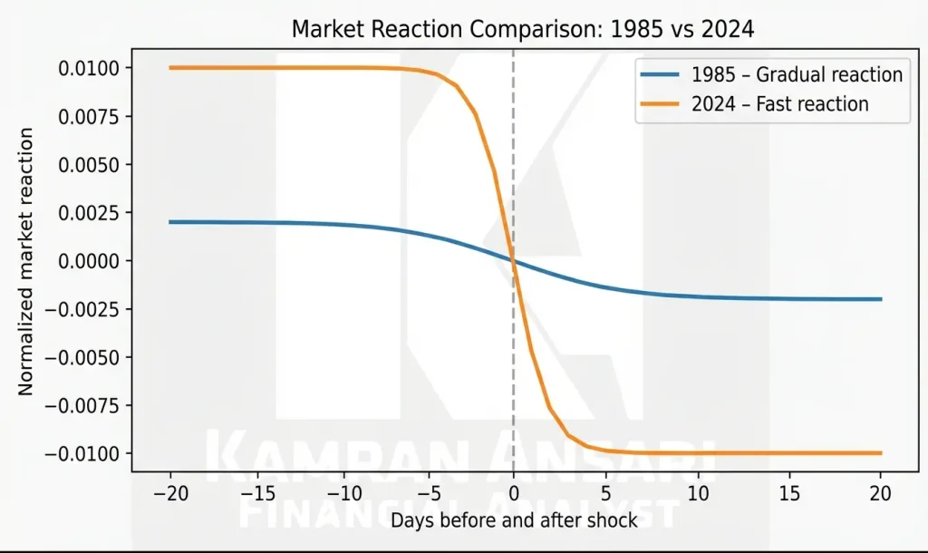 در سال ۱۹۸۵ (خط آبی)، واکنش بازار بهصورت تدریجی و با تأخیر زمانی چندروزه تا چندهفته شکل گرفته است؛ اما در سال ۲۰۲۴ (خط نارنجی)، همان شوک مشابه ظرف ساعات تا چند روز جذب شده و تغییر قیمتها سریع و آنی رخ داده است. این تفاوت بیانگر تحول ساختاری در سرعت پردازش اطلاعات و تصمیمگیری معاملهگران در عصر هوش مصنوعی و دسترسی بلادرنگ به دادههاست