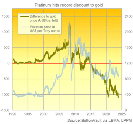 نمودار: ثبت رکورد تاریخی اختلاف قیمت پلاتین با طلا (۱۹۹۰–۲۰۲۴) این نمودار، پویایی قیمت پلاتین (خط آبی روشن، مقیاس راست) را در مقایسه با طلا نشان می‌دهد. اما نکته کانونی در خط سبز تیره (مقیاس چپ) است که اختلاف دلاری قیمت طلا و پلاتین را به نمایش می‌گذارد.