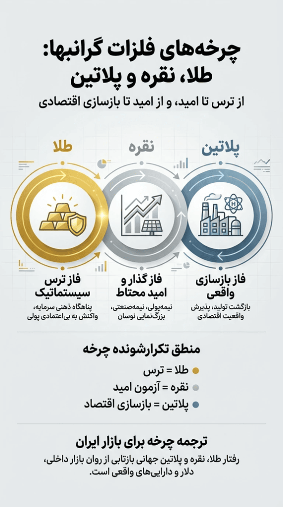 این مقاله توضیح می‌دهد که چرا حرکت طلا، نقره و پلاتین یک چرخه‌ی سه‌مرحله‌ای ثابت در بازارهای جهانی ایجاد می‌کند. طلا اولین واکنش به ترس و نااطمینانی است؛ نقره مرحله‌ی گذار و بزرگ‌نمایی امید محتاطانه؛ و پلاتین نشانه‌ی شروع بازسازی اقتصادی و بازگشت اعتماد به تولید.